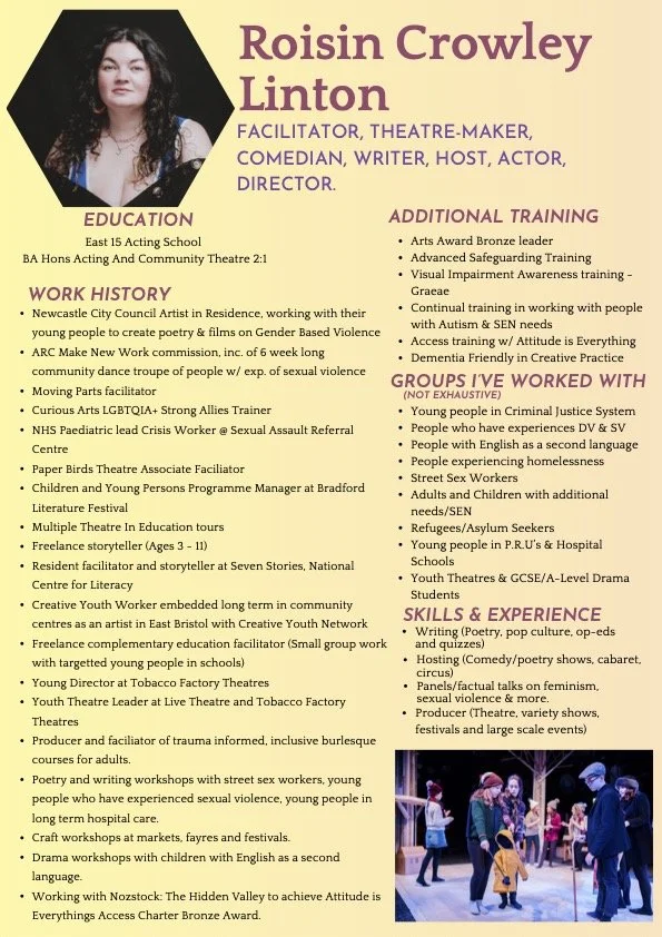 “Roisin Crowley Linton demonstrated exceptional professionalism in her work alongside a group of young people on a gender‑based violence creative project, providing consistent inspiration, guidance and support throughout. Her approach not only enabled the group to deliver a powerful and emotionally resonant presentation at Newcastle Civic Centre Council Chambers, but also successfully springboarded their confidence, ambition and drive to carry this important work forward. The launch stood out as one of the most accomplished and authentic projects witnessed, engaging peers, families, professionals and elected representatives alike.” - Alison Flanagan Wood, Community Events Officer, Arts, Culture & Events Team, Newcastle City Council